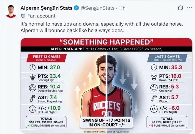 很多火箭球迷都不理解,为何申京最近几场比赛表现如此低迷,神鬼莫测,明明前13场比赛场均可以拿到23.4分10.4篮板7.4助攻,正负值+142;可最近三场球,场均跌落至16分5.3篮板5.7助攻,三场比赛合计-18,在没有遭遇伤病的情况下,滑落如此明显,令人费解。